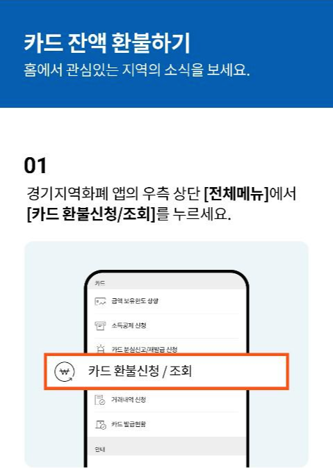 1. 경기지역화폐 앱의 우측상단 [전체메뉴]에서 [카드 환불신청/조회]를 누르세요.