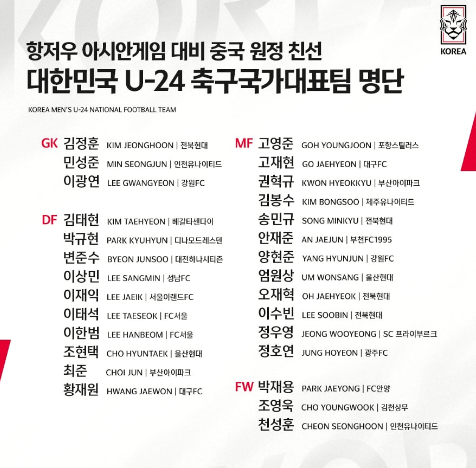 대한민국 U-24 축구국가대표팀 명단은 다음과 같습니다.