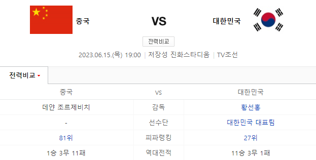 한국과 중국 역대전적은 11승 3무 1패로 한국이 앞도적으로 앞서 있습니다. 한국의 피파랭킹은 27위이며 중국은 81위를 기록하고 있습니다. 중국은 데얀 조르제비치 감독이 한국은 황선홍 감독이 선수들을 이끌고 있습니다.