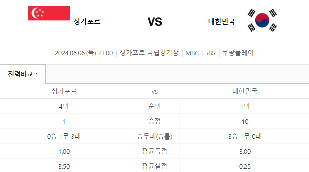 우선 한국의 경우 싱가포르는 피파랭킹이 155위, 대한민국이 24위로 랭킹차이가 있습니다. 하지만 지난 아시아챔피언스리그에서 싱가포르 클럽 라이언시티 팀이 K리그 전북현대 모터스를 상대로 2-0 승리를 하였고 이번 대표팀 선수 절반정고가 라이언시티 소속입니다.