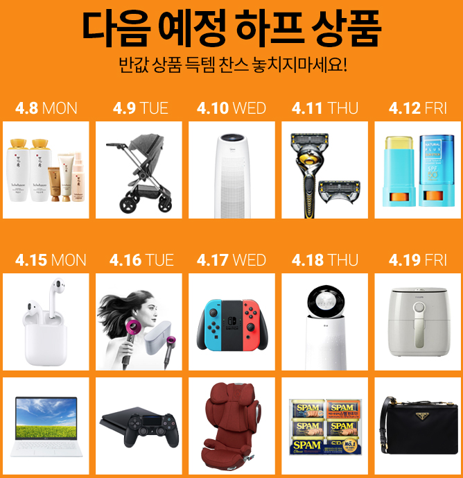 4월8일부터 19일까지 다양한 상품의 반값 특가 이벤트를 진행한다.공기청정기부터, 유모차